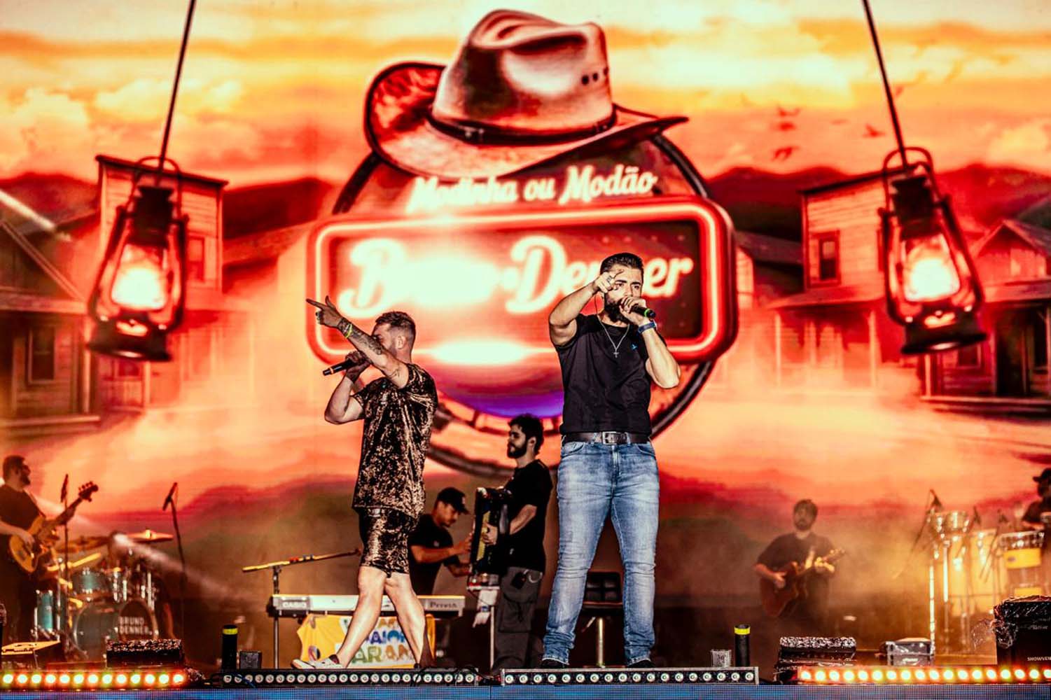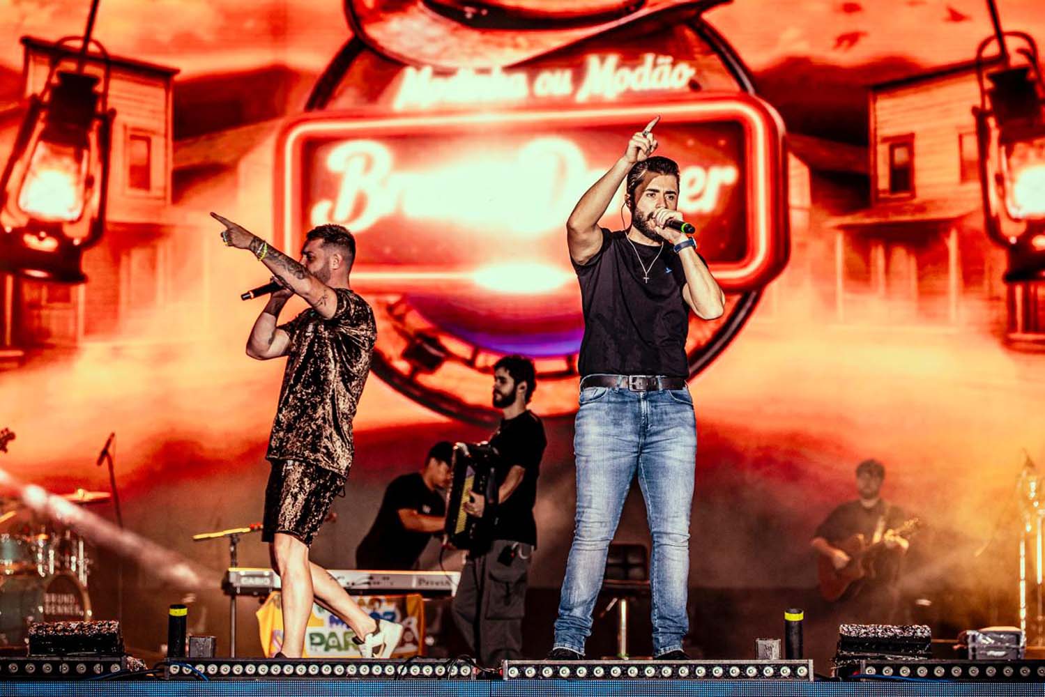 No palco, os artistas apresentaram um repertório que transitou entre o sertanejo universitário e o modão, com canções autorais como “Estado Civil”, colaboração com Gusttavo Lima — padrinho da dupla e tio de Bruno —, além de “O Jeito é Beber”.