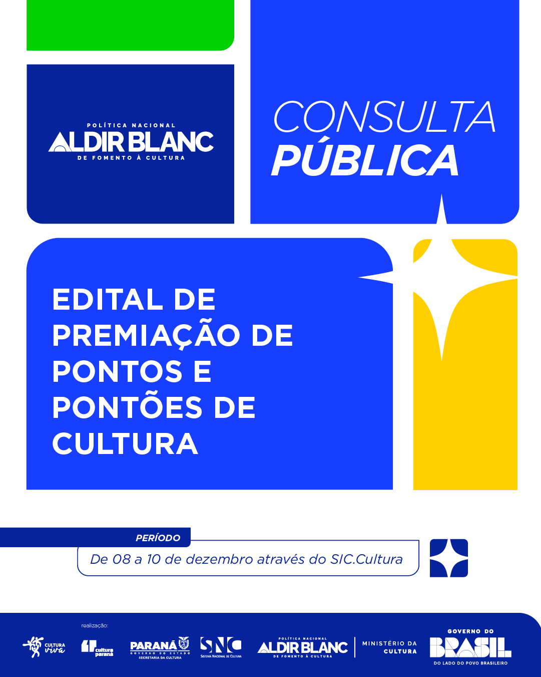 A Secretaria de Estado da Cultura (SEEC), abre consulta pública para o Edital de Premiação de Pontos e Pontões de Cultura. A iniciativa íntegra a Política Nacional de Cultura Viva (PNCV), com recursos provenientes do Governo Federal e repassados ao Paraná por meio da Política Nacional Aldir Blanc (PNAB) - Ciclo 2.
