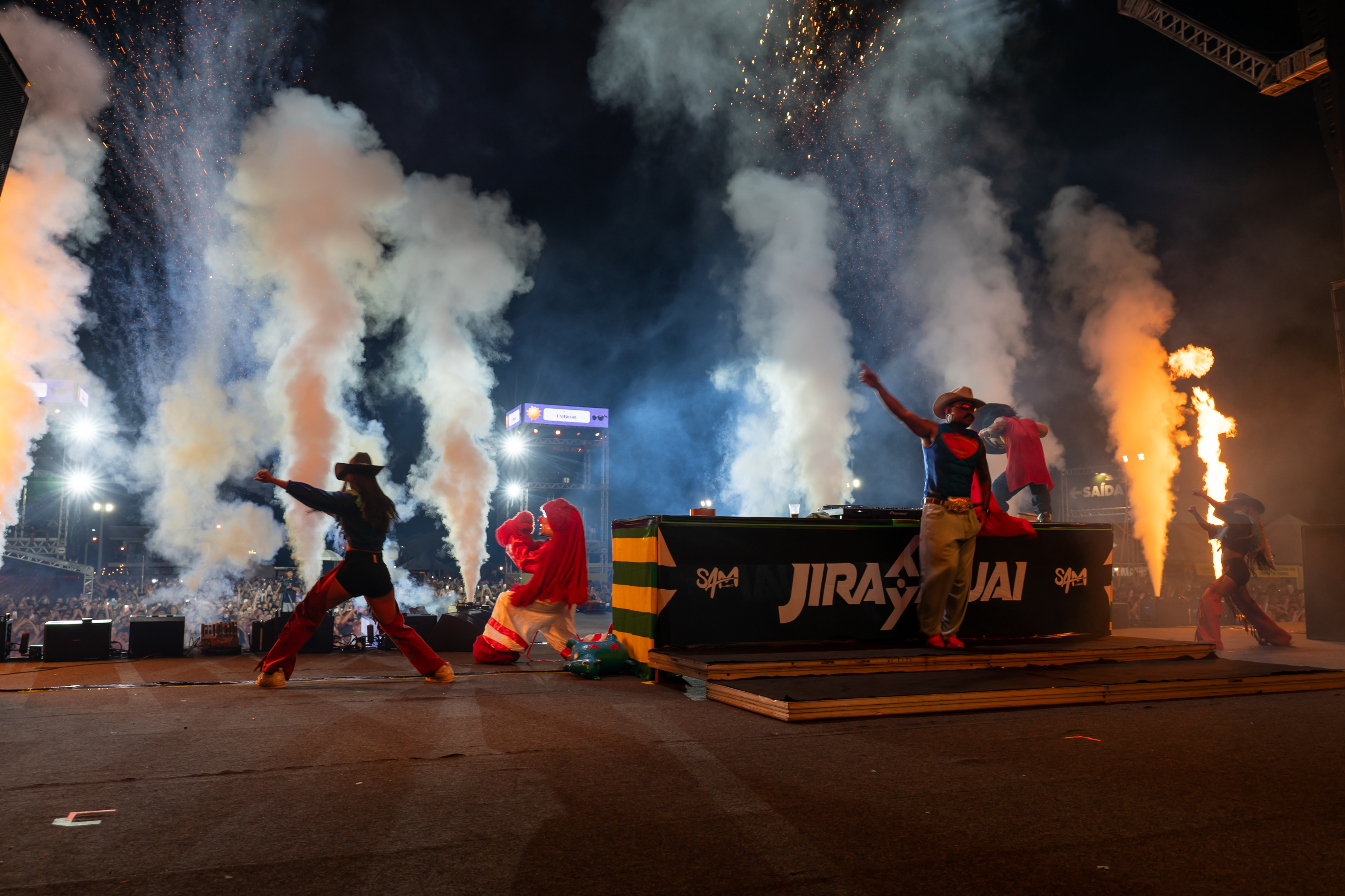ABERTURA – A noite de entretenimento de qualidade, no entanto, já havia começado com um show, em seu sentido mais performático, regado a música eletrônica inspirada no sertanejo, no funk e no forró. A figura ímpar do DJ Jiraya Uai, que tem nome de ninja e se veste como super-herói, dominou o palco com uma turma tão expressiva quanto ele: uma espécie de carreta furacão com direito a um mini-Jiraya bastante expressivo. Um visual tão extravagante quanto a animação que tomou conta da arena.