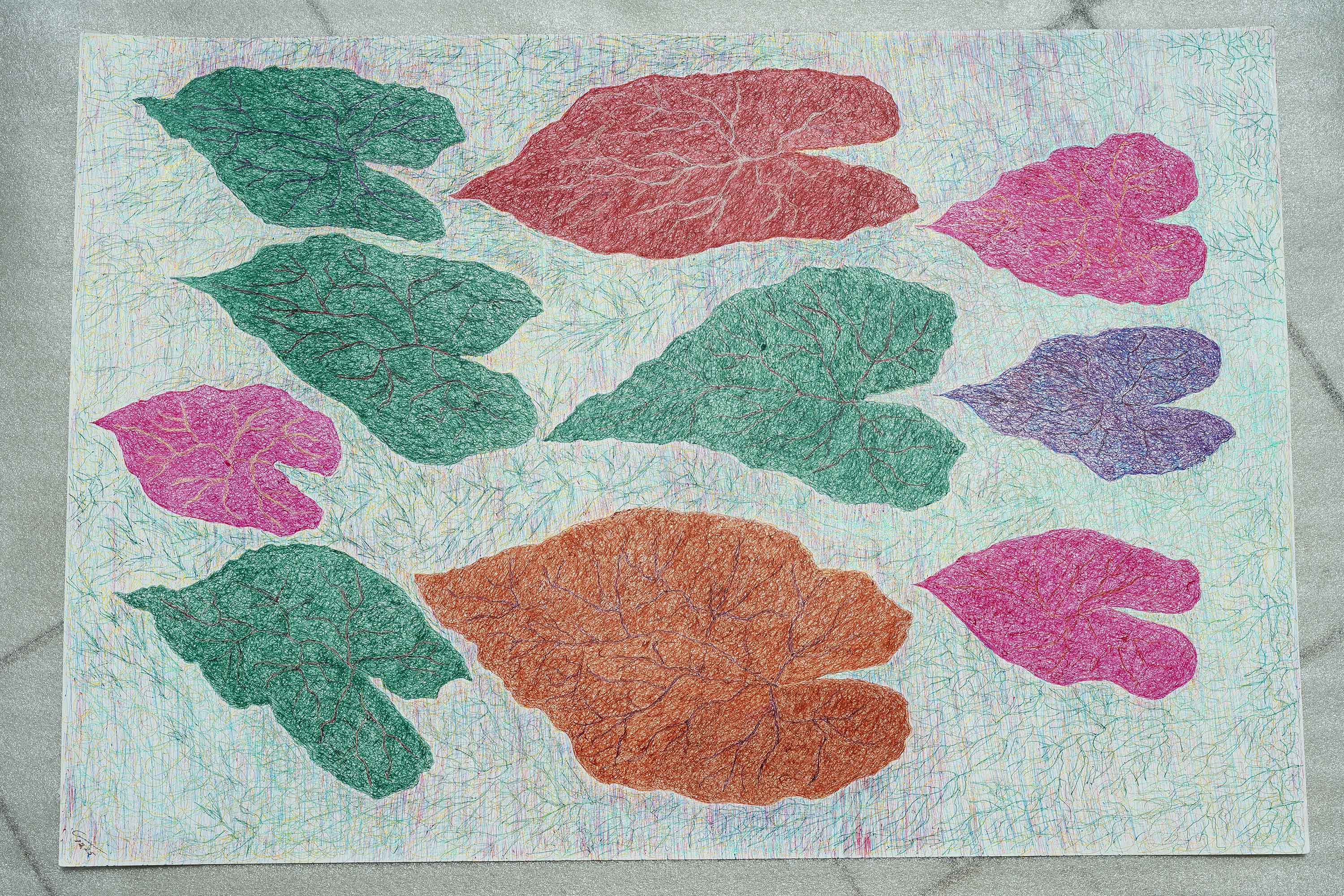 As composições evidenciam tramas lineares persistentes que organizam campos florais, massas vegetais e núcleos de irradiação luminosa. “A insistência do traço não opera como automatismo, mas como método: o tempo do fazer torna-se visível na superfície, e o acúmulo de linhas consolida ritmos internos que orientam a leitura das imagens”, diz o artista.