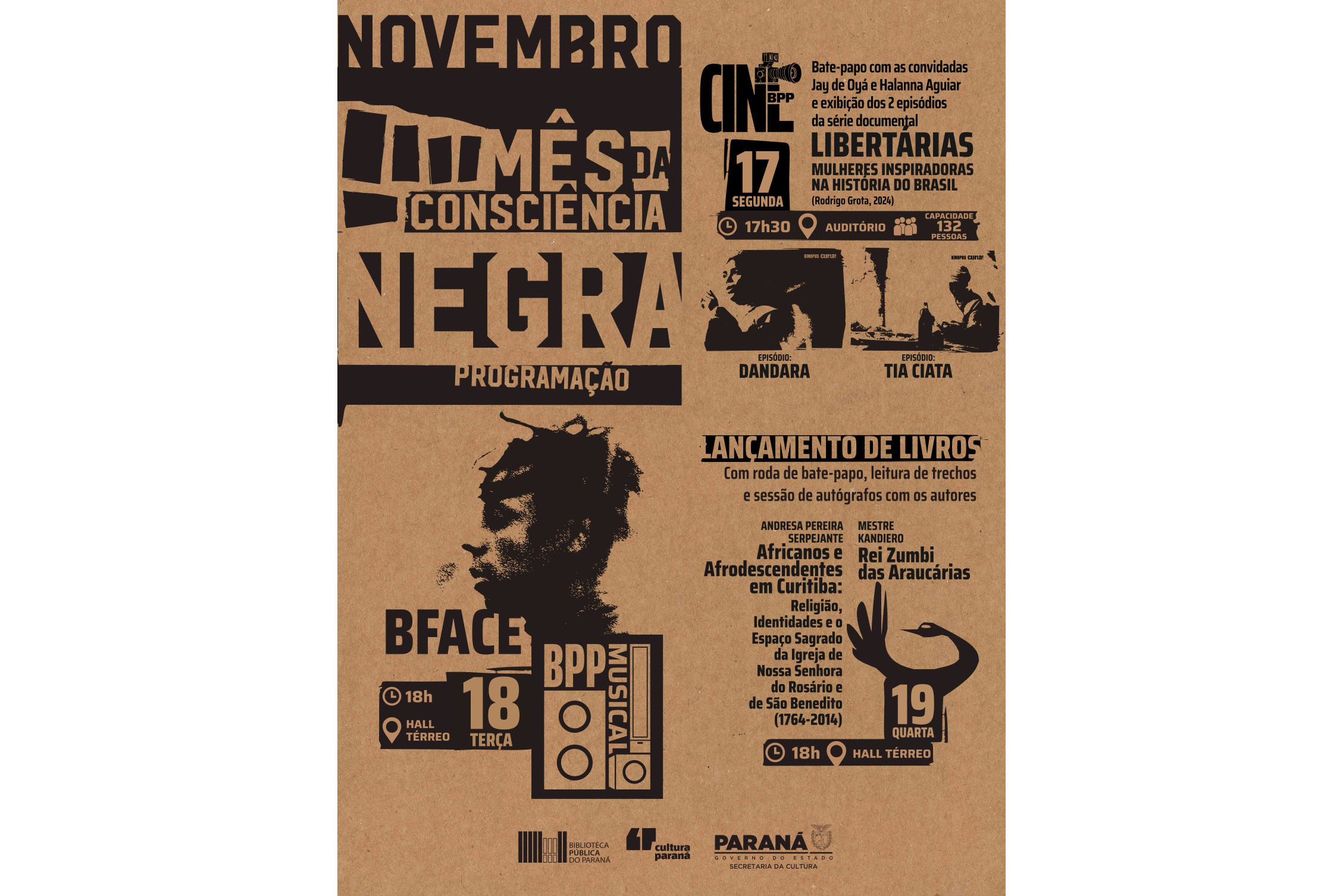 Já na Biblioteca Pública do Paraná, o Cine BPP marca o início da programação temática para o Dia da Consciência Negra com a série documental "Libertárias – mulheres inspiradoras na história do Brasil", com exibição dos episódios Dandara e Tia Ciata, e bate-papo com a sambista Jay de Oyá e a produtora cultural Halanna Aguiar.
