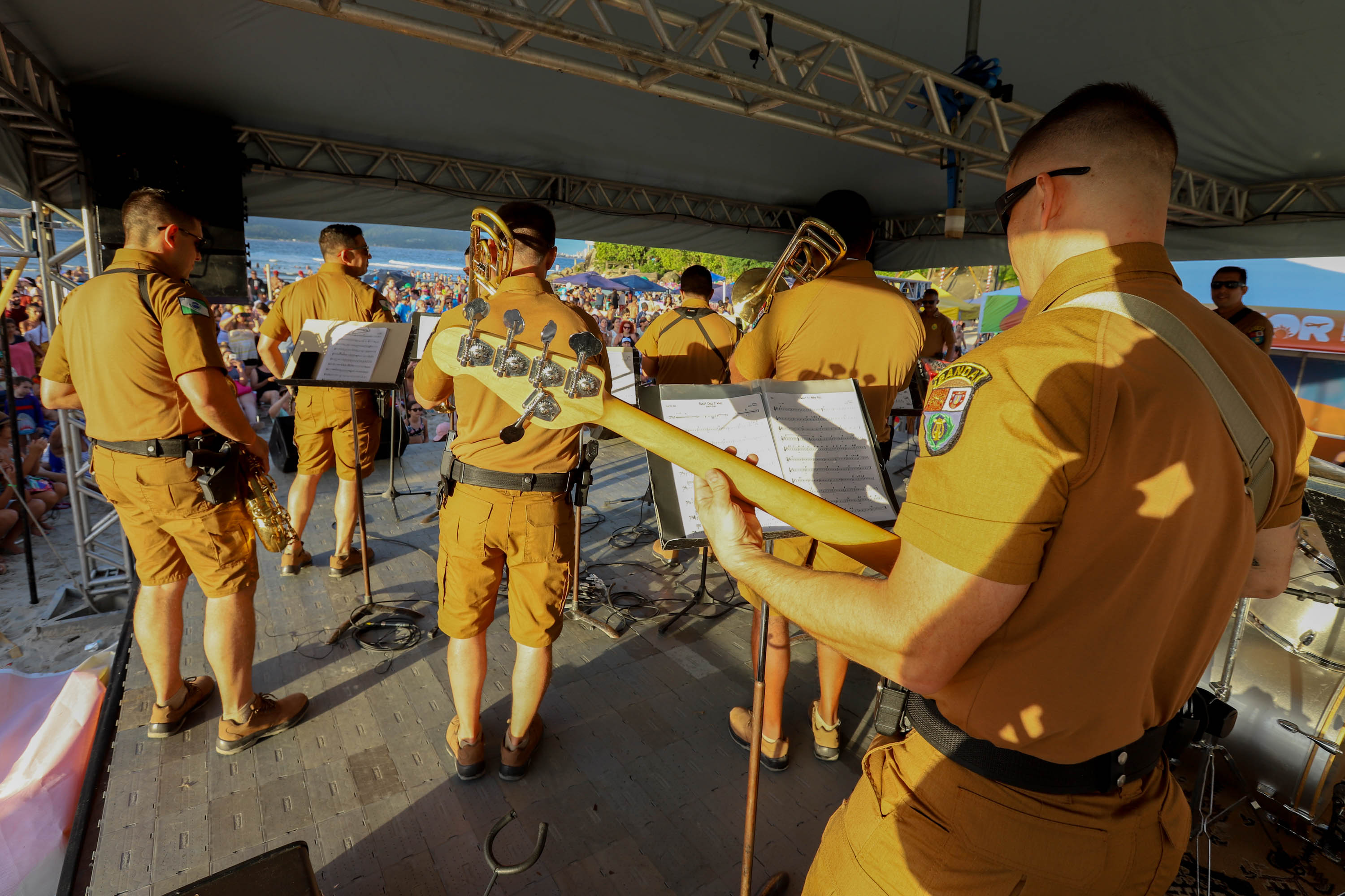 As apresentações da banda da PM começaram na edição 2024/2025, nos palcos Sunset montados nos balneários do Litoral. O formato chamou atenção do público: não é todo dia que se vê policiais fardados cantando sucessos do rock, do pop, do pagode e do sertanejo. Com repertórios inusitados, performances animadas e vídeos compartilhados por quem assistia, a banda rapidamente ganhou projeção e tomou as redes sociais, atraindo fãs e somando milhares de visualizações.