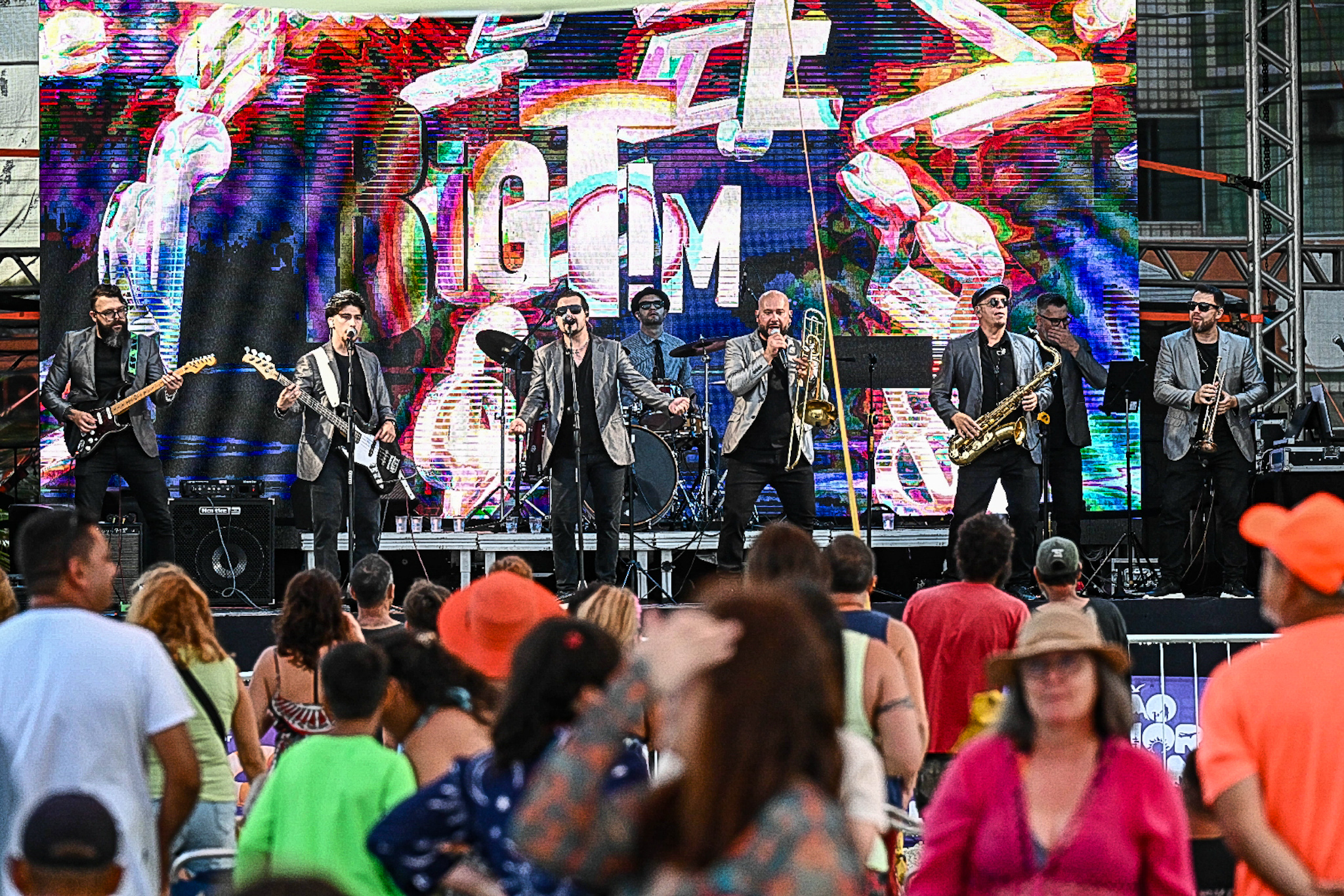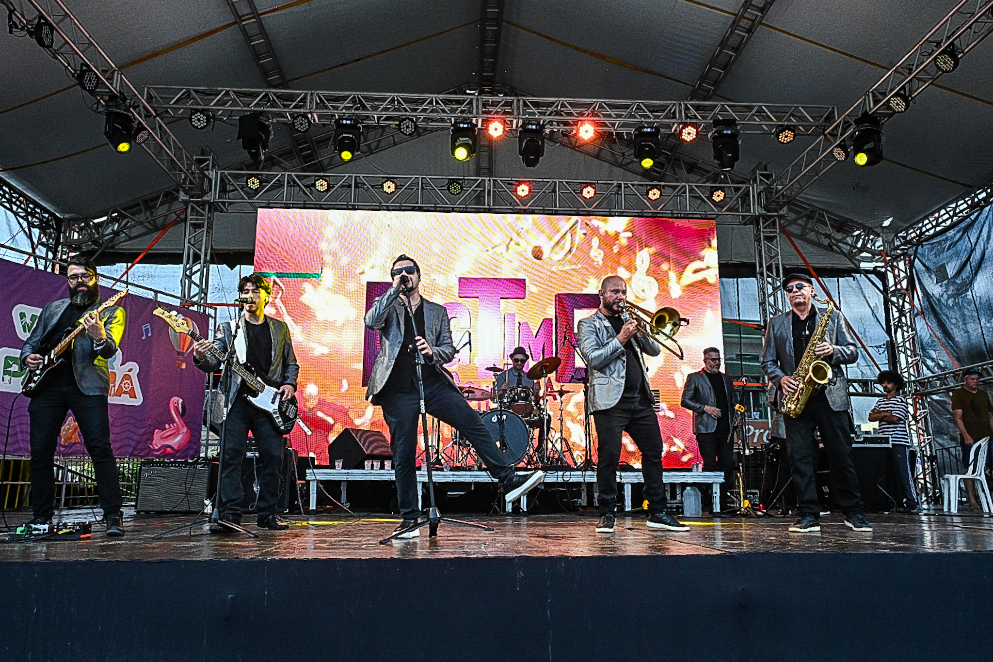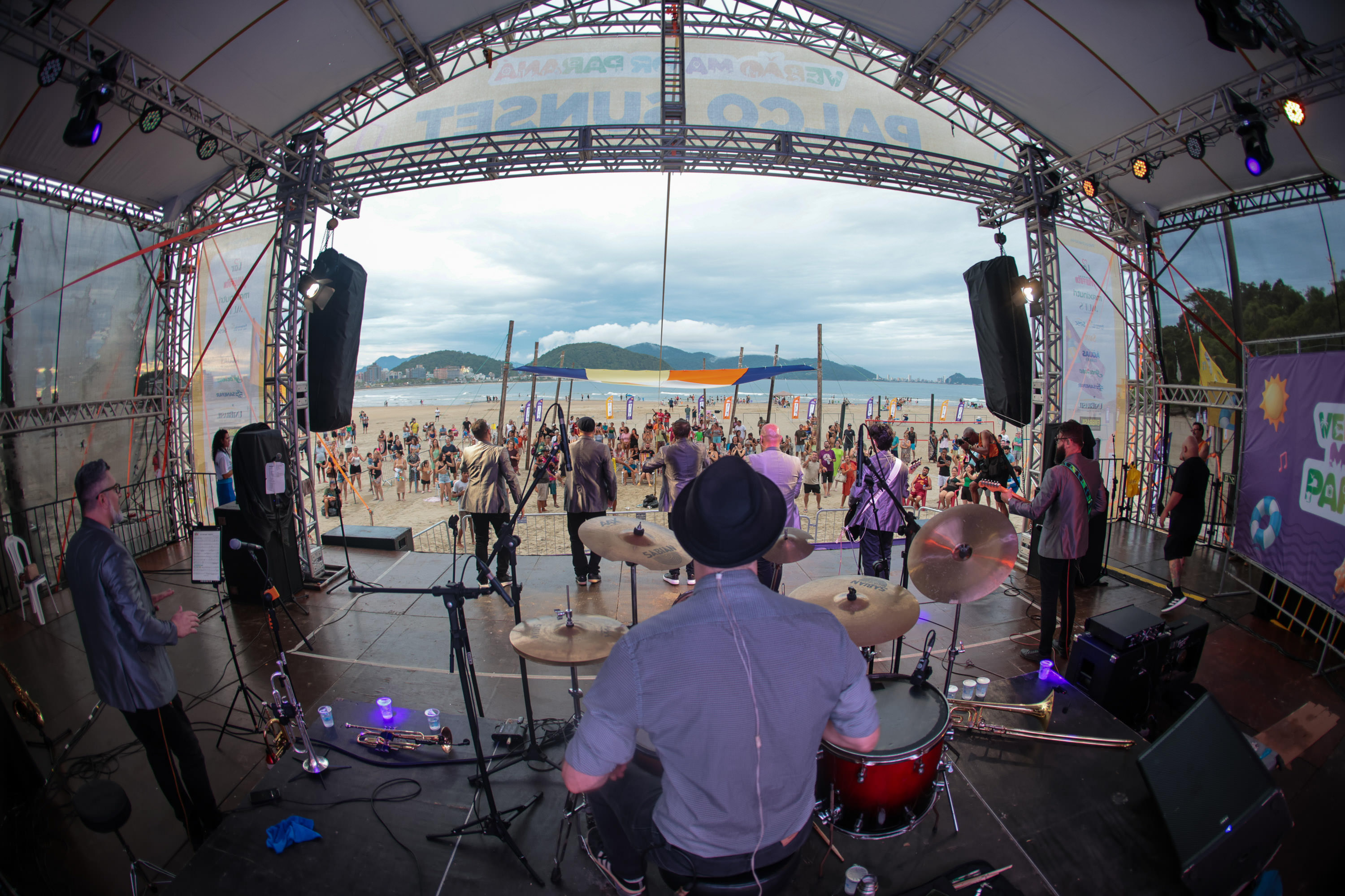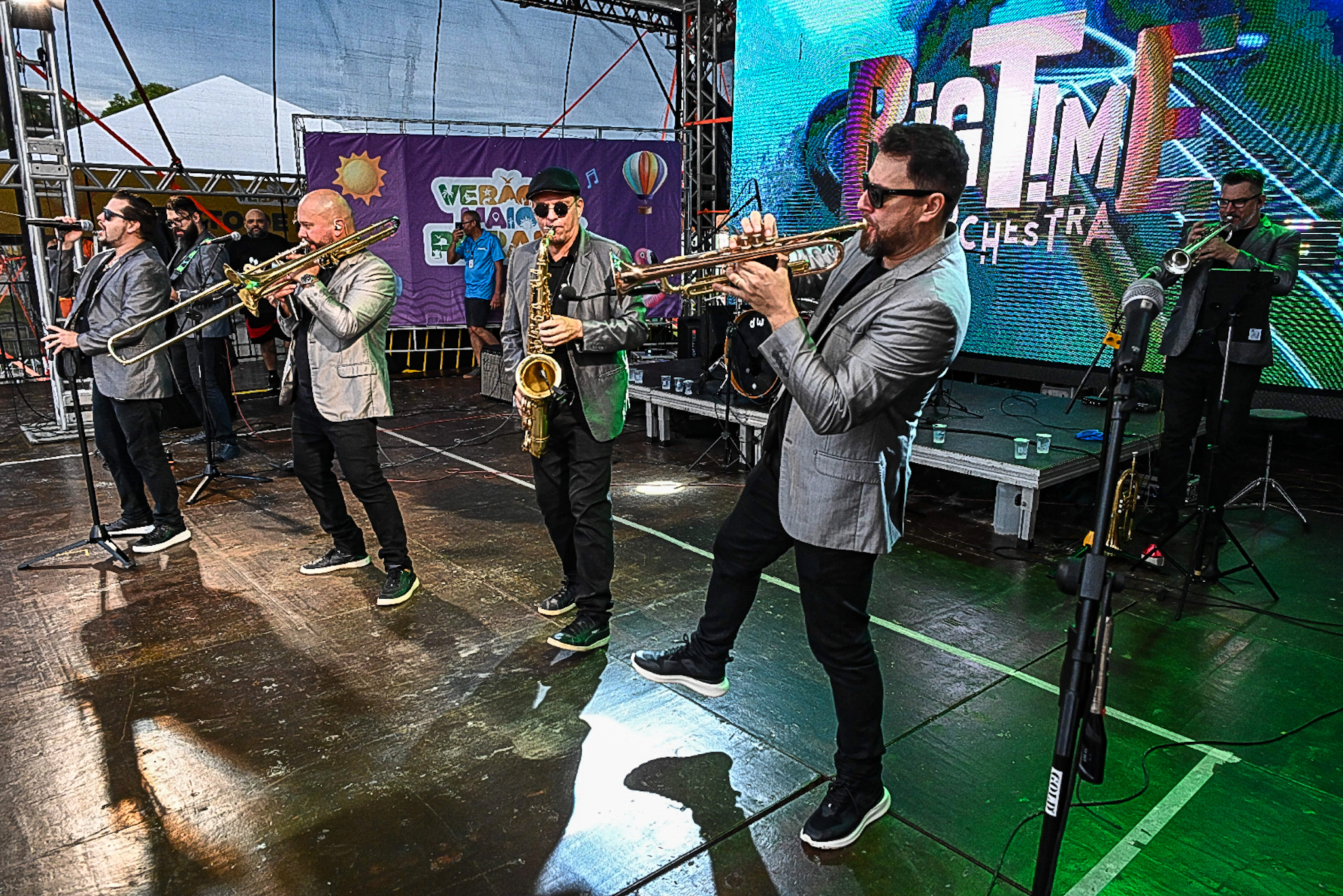 O Palco Sunset do Verão Maior Paraná em Guaratuba recebeu, na noite desta quarta-feira (14), mais uma apresentação da programação musical gratuita à beira-mar. A atração da vez foi a Big Time Orchestra, banda paranaense que animou as centenas de pessoas presentes com releituras de sucessos nacionais e internacionais em ritmos como rock, rockabilly, soul e jazz, com metais, coreografias e participação ativa da plateia.