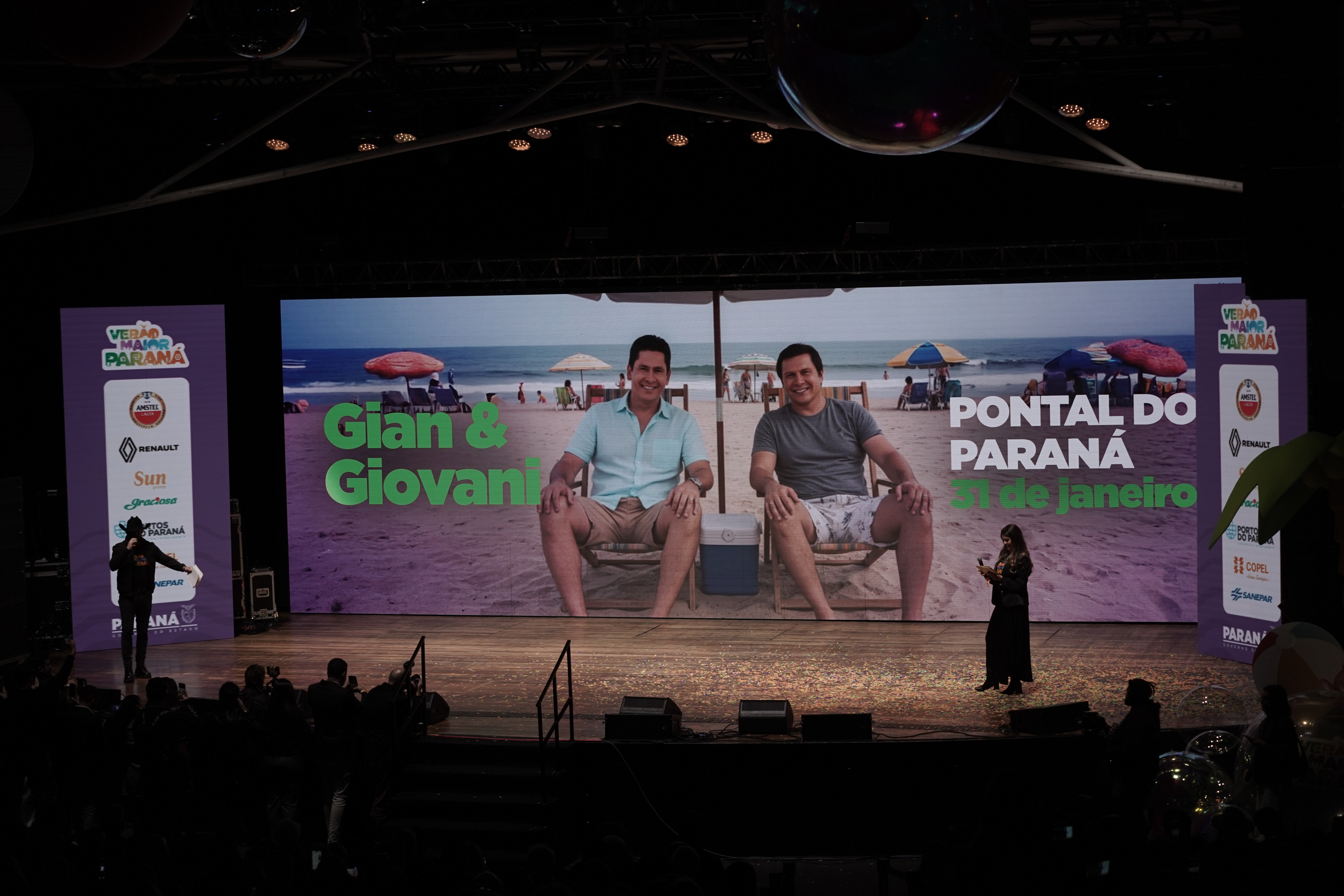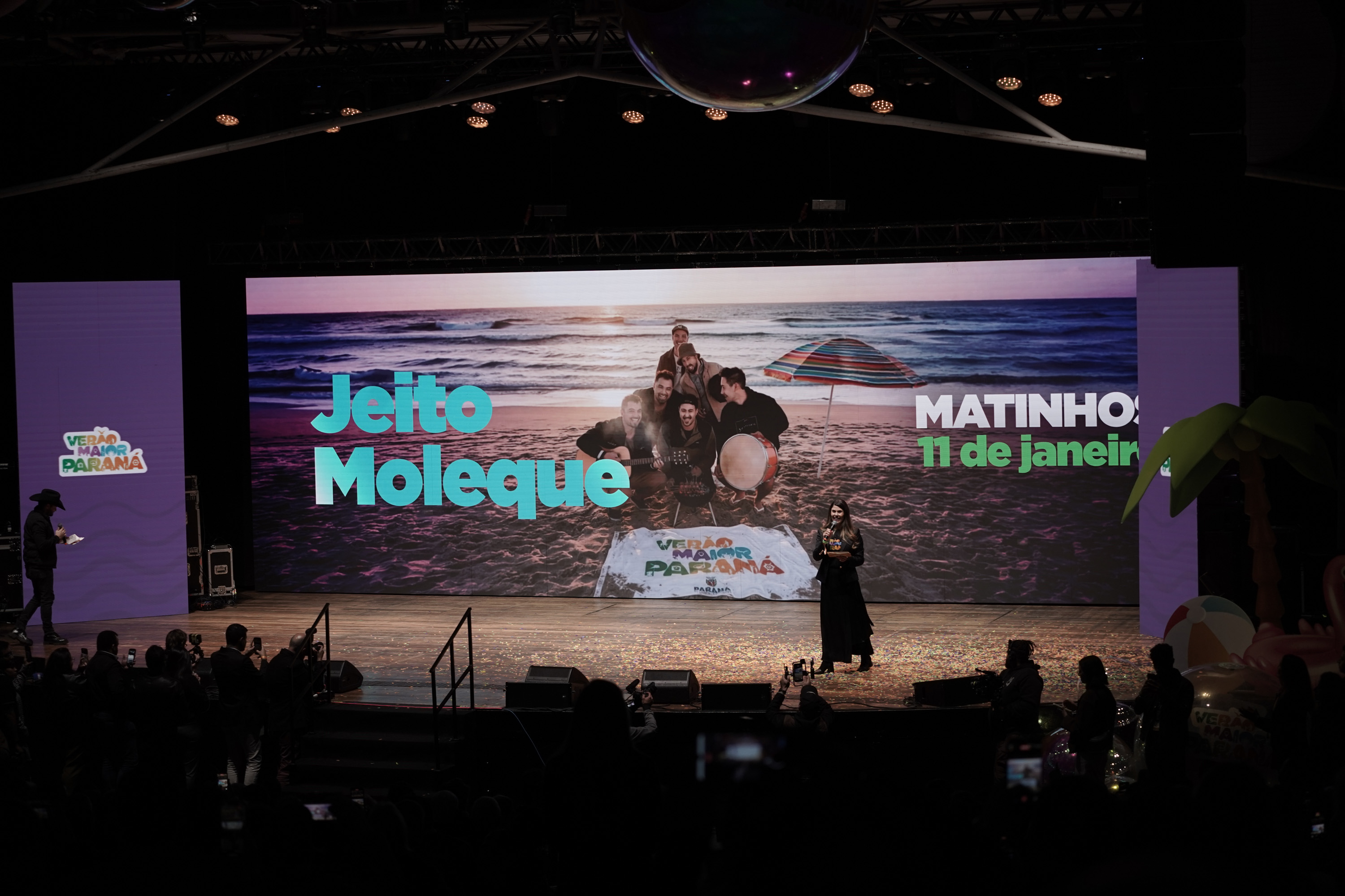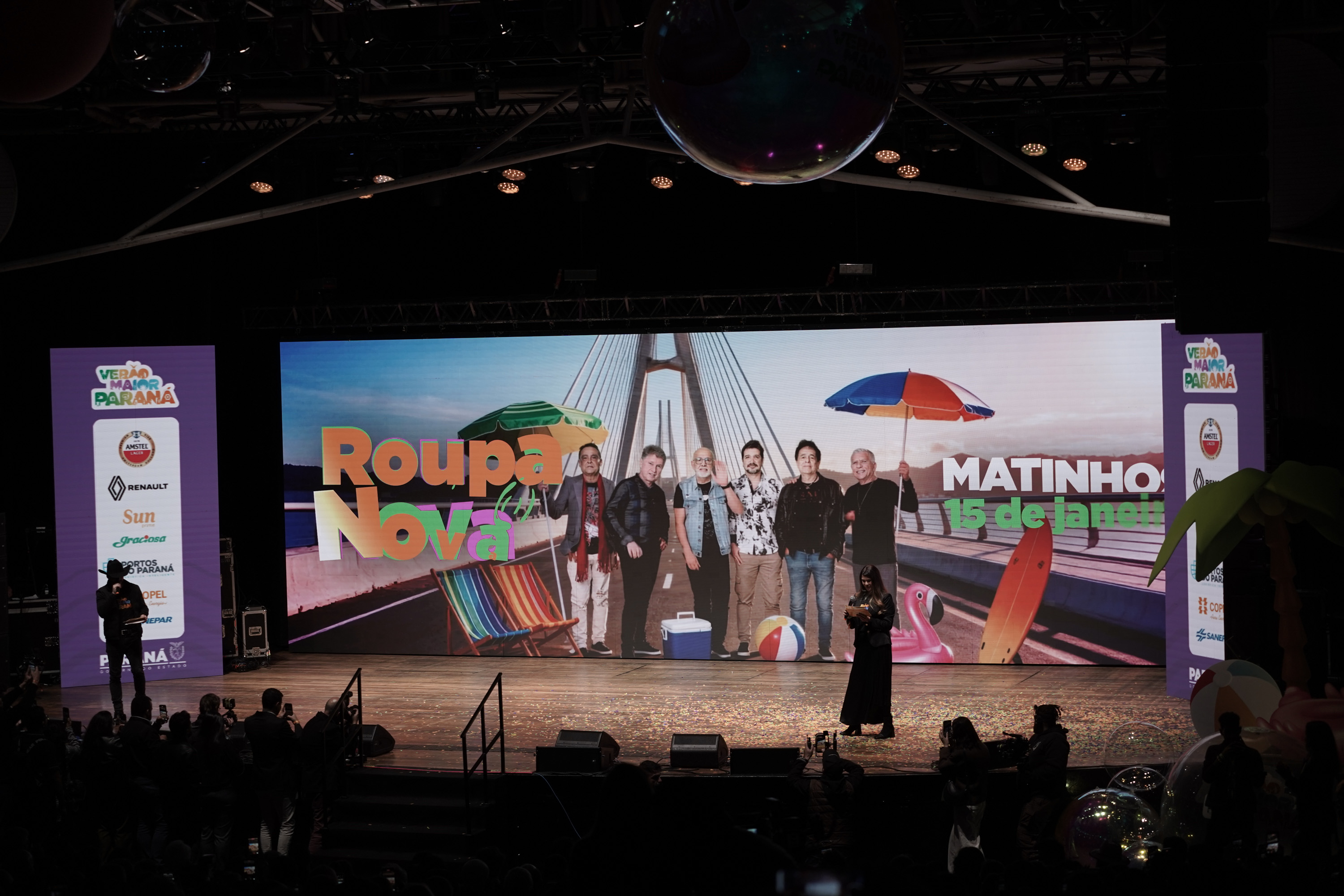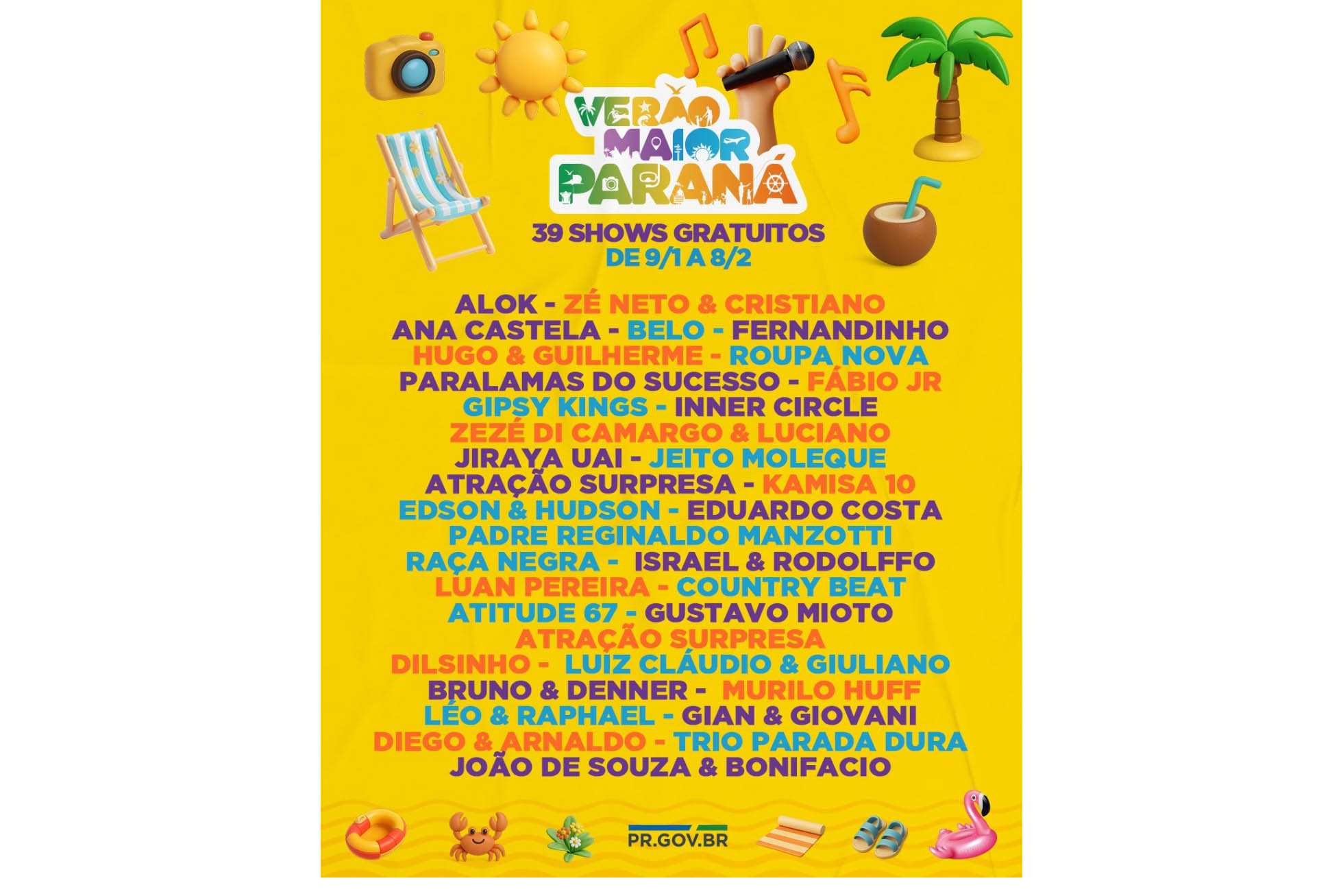 O Governo do Paraná anunciou nesta terça-feira (21) os nomes das atrações do Verão Maior Paraná 2026. São cinco finais de semana seguidos de espetáculos gratuitos, de 9 de janeiro a 8 de fevereiro. Entre as novidades estão shows nas quintas-feiras, atrações internacionais e palcos que devem ser maiores do que no ano passado. Os shows acontecerão nas praias de Matinhos e Pontal do Paraná e terão transmissão do SBT, Band, TVCI, Banda B e TV Paraná Turismo para todo o Brasil.